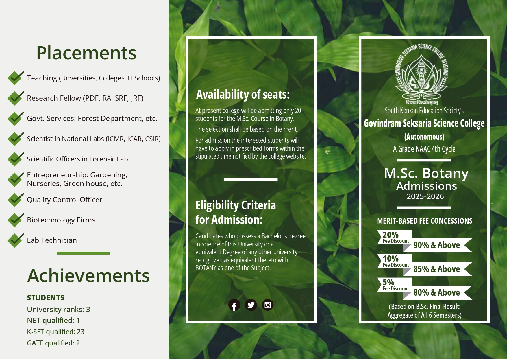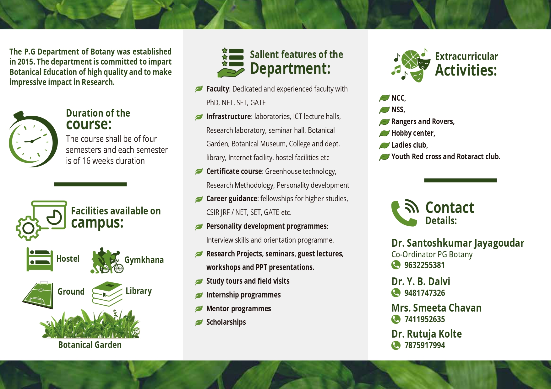 The Botany Department has well qualified faculty with PhD, NET, SET, GATE. Department has quality infrastructure to conduct UG and PG courses. There are eight well equipped laboratories and lecture Halls, presentation rooms, a Research laboratory with various instruments like Spectrophotometer ,Soxhlet apparatus, Laminar air flow Hood, Agarose gel electrophoresis kits, Autoclave Incubator etc.Botanical Museum,a Botanical garden with greenhouse and rich variety of plants, Vermi-compost units,Water Harvesting System ,Effluent Treatment Plant etc.,The Department has its own library with many books and National & International Journals. It has entered into MOU’S with Gogate Jogalekar college,Ratngiri Maharastra and Mhadei research center,Chorla Belgavi for academic and research activities .The department has done QR coding of more than 1000 tree plants in college campus as a step towards e-learning. As our college has well equipped lab and classroom facility RCU university Botany department is also running in our campus.